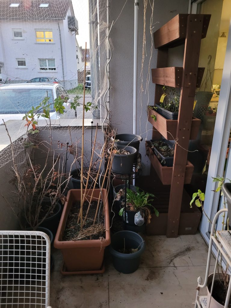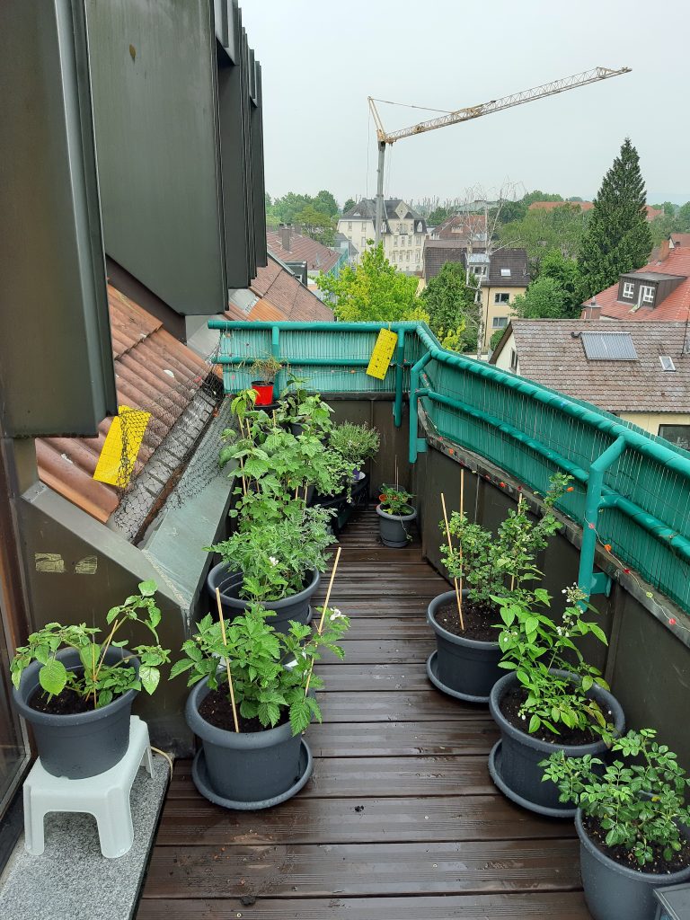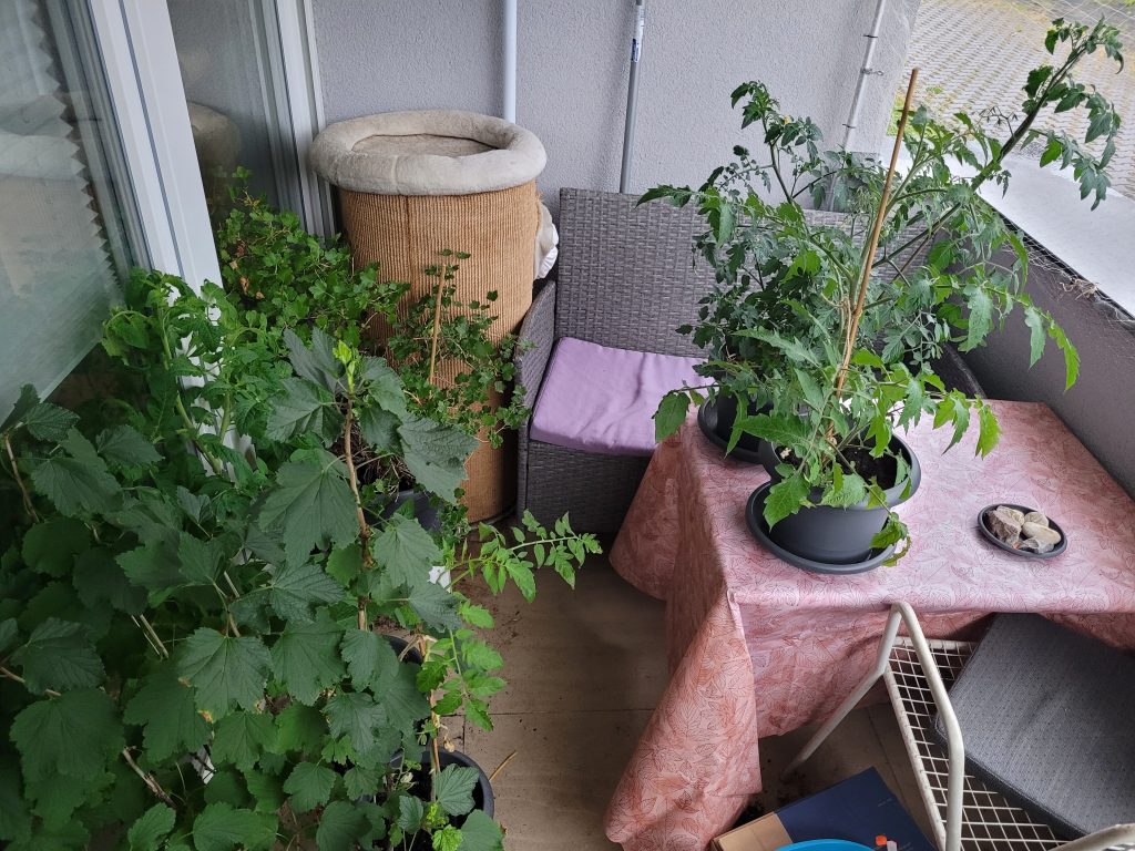 (die Tomatillos kommen wieder in die pralle Sonne auf der Brüstung, die Himbeere lieber etwas geschützter neben die Katzentonne) - Kommt sich die Pflanze womöglich mit anderen Kulturen in die Quere?